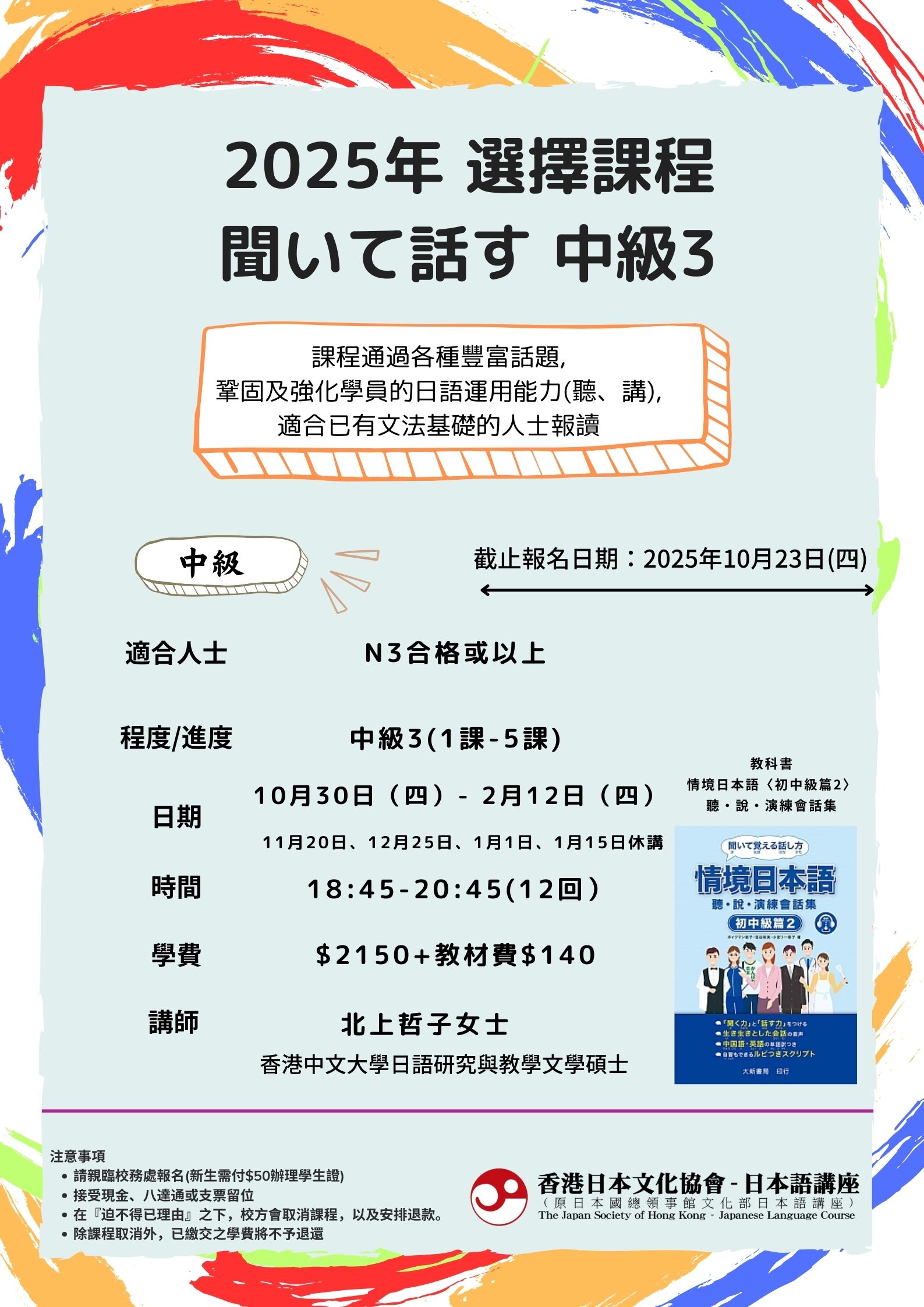 「聞いて話す」課程會通過各種豐富話題,鞏固及強化學員的初級日語運用能力,適合已有文法基礎的同學報讀。 課程主要以「聽」及「講」為練習主體,同時亦以「讀」及「寫」的練習作為輔助。 *「聞いて話す 中級1」課程改為北上老師任教 *「聞いて話す 中上級3」課程改為石田老師任教