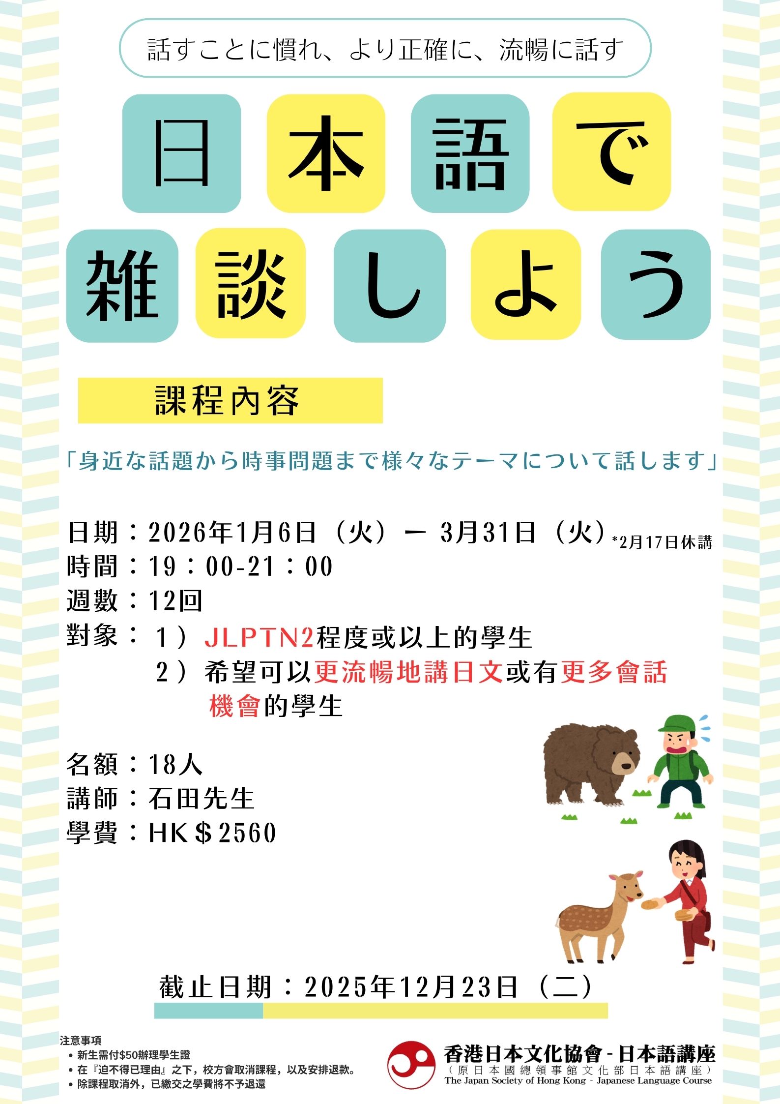 話すことに慣れ、より正確に、流暢に話すことができるようになる *「日本語で雑談しよう」課程改為石田老師任教