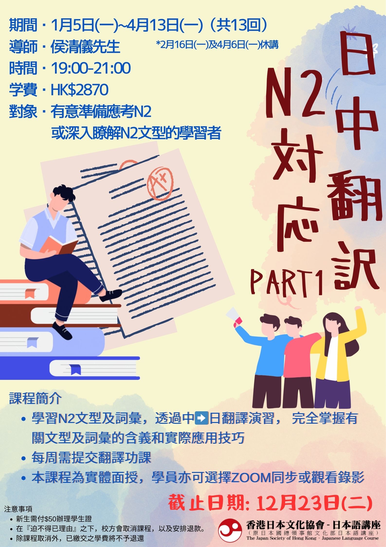 學習N2文型,透過中日/日中翻譯演習,完全掌握有關文型的含義和實際應用技巧。 每周需提交翻譯功課。本課程為實體面授,學員亦可選擇ZOOM同步或觀看錄影。