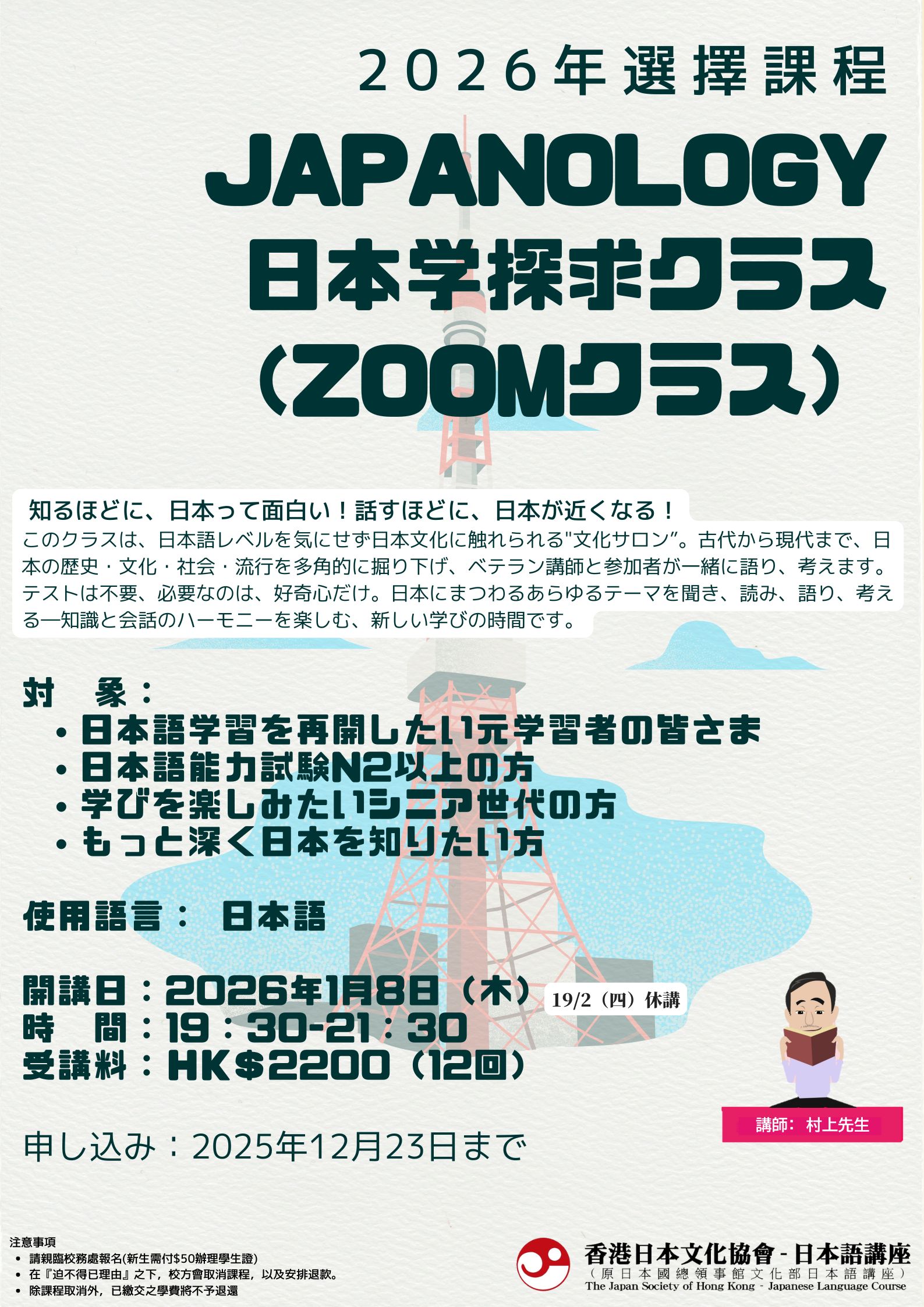 越了解日本就越有趣!越開口交流就越貼近日本! 這門課是一個不論日語程度,都能自在接觸日本文化的「文化沙龍(文化サロン)」。從古代到現代深入探討日本的歷史、文化、社會與流行,由本校人氣導師村上先生與參加者共同交流、思考。 不需要考試,你只需要帶著好奇心。在這裡,你將透過聆聽、閱讀、討論與思考,探索各種與日本相關的主題,享受知識與對話交織的美妙和諧的一段全新的學習時光。
