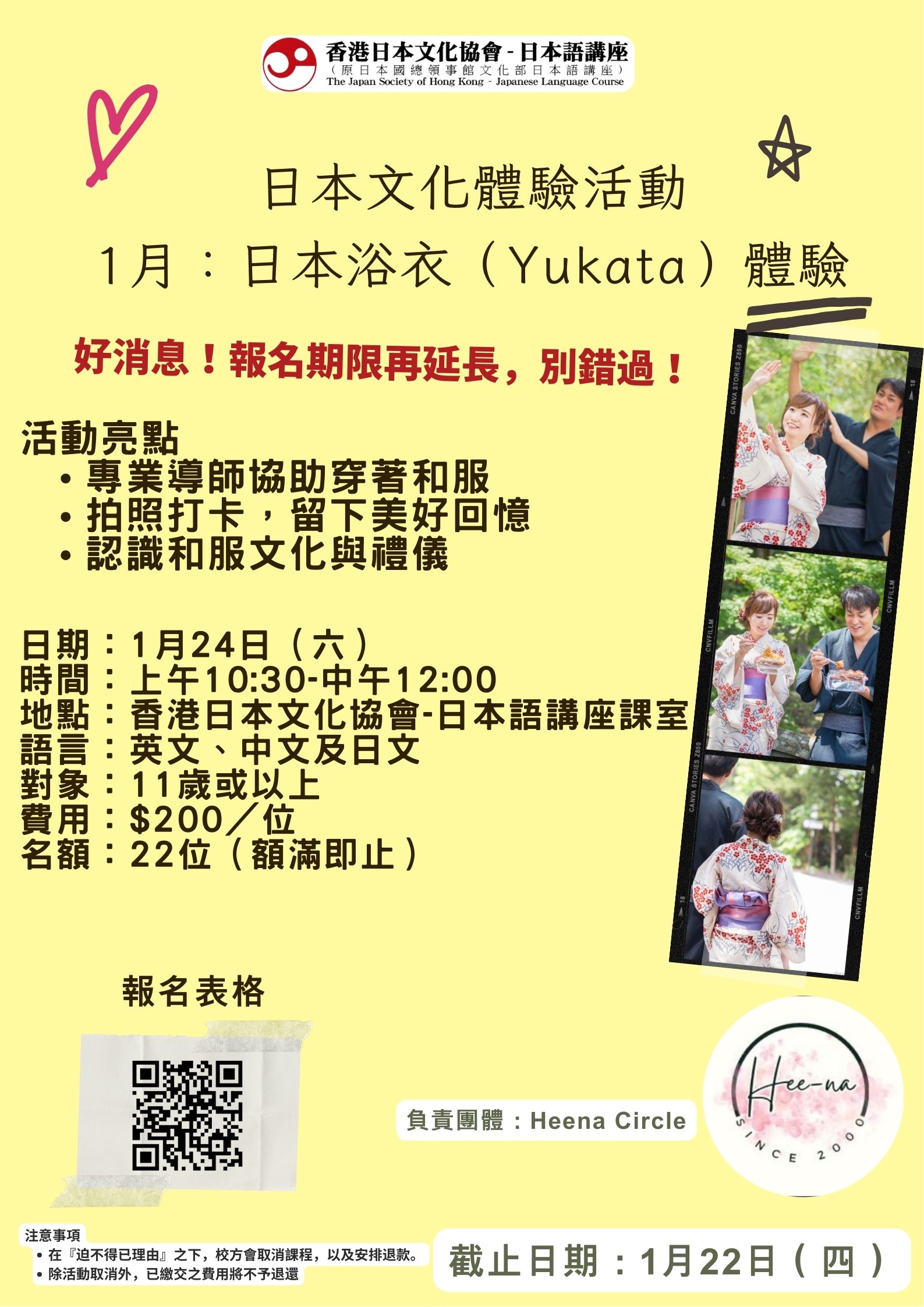日本文化體驗活動 1月:日本浴衣(Yukata)體驗 【報名期限延長】