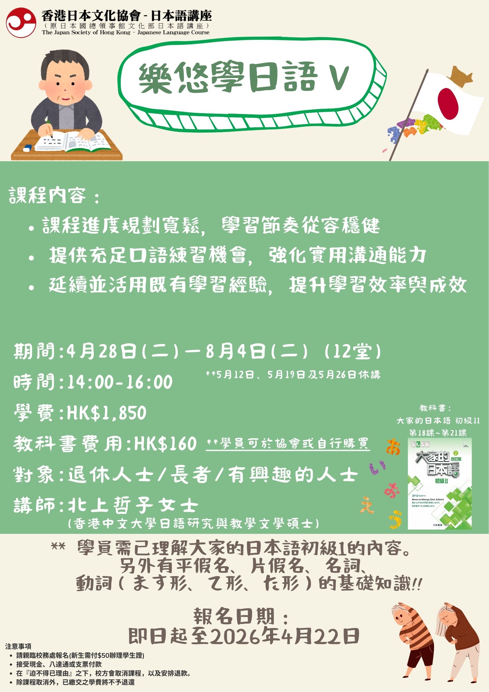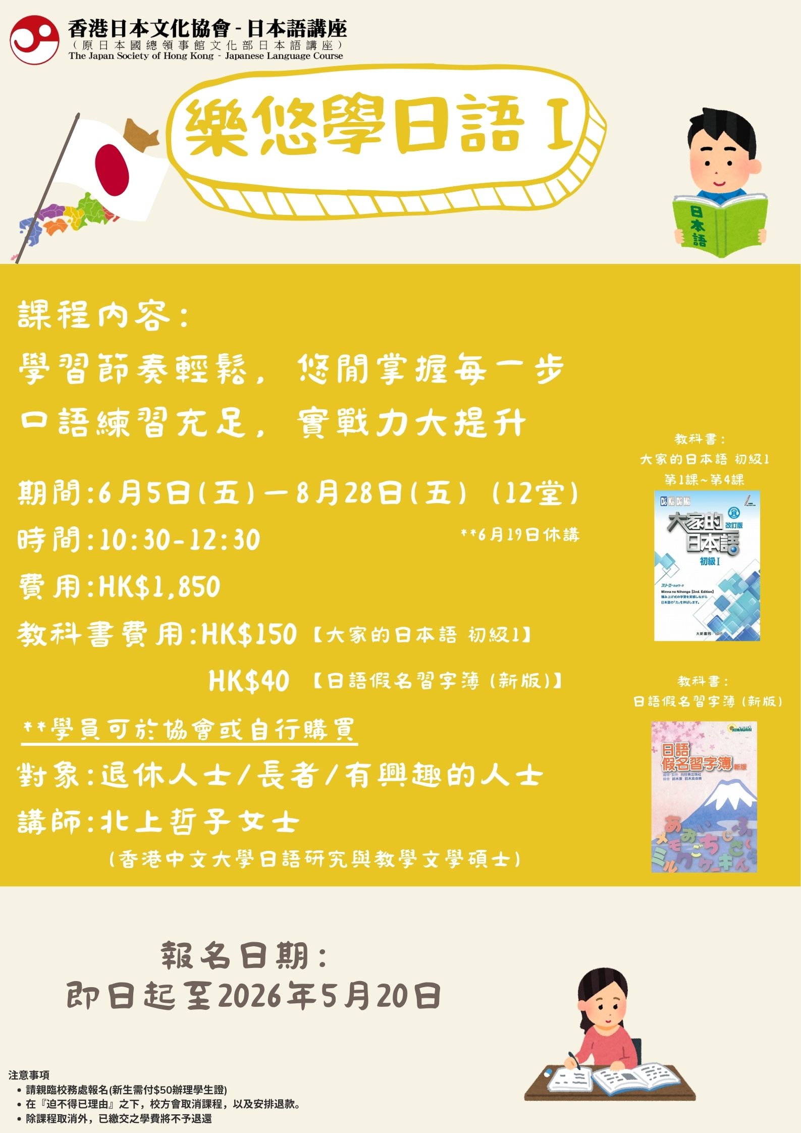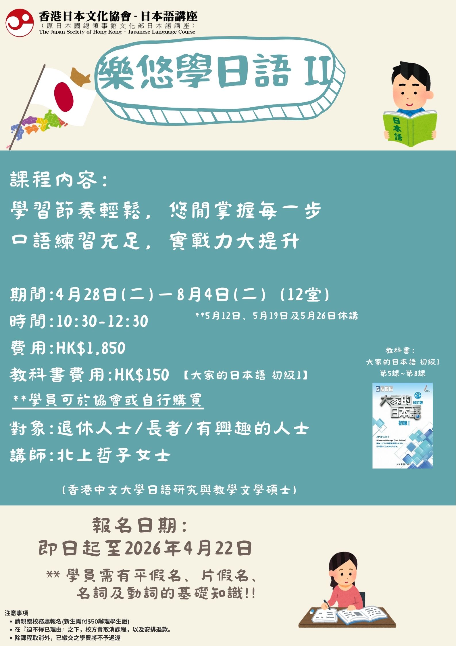 親臨日本語講座校務處報名 (香港北角英皇道663號泓富產業千禧廣場207-211室)