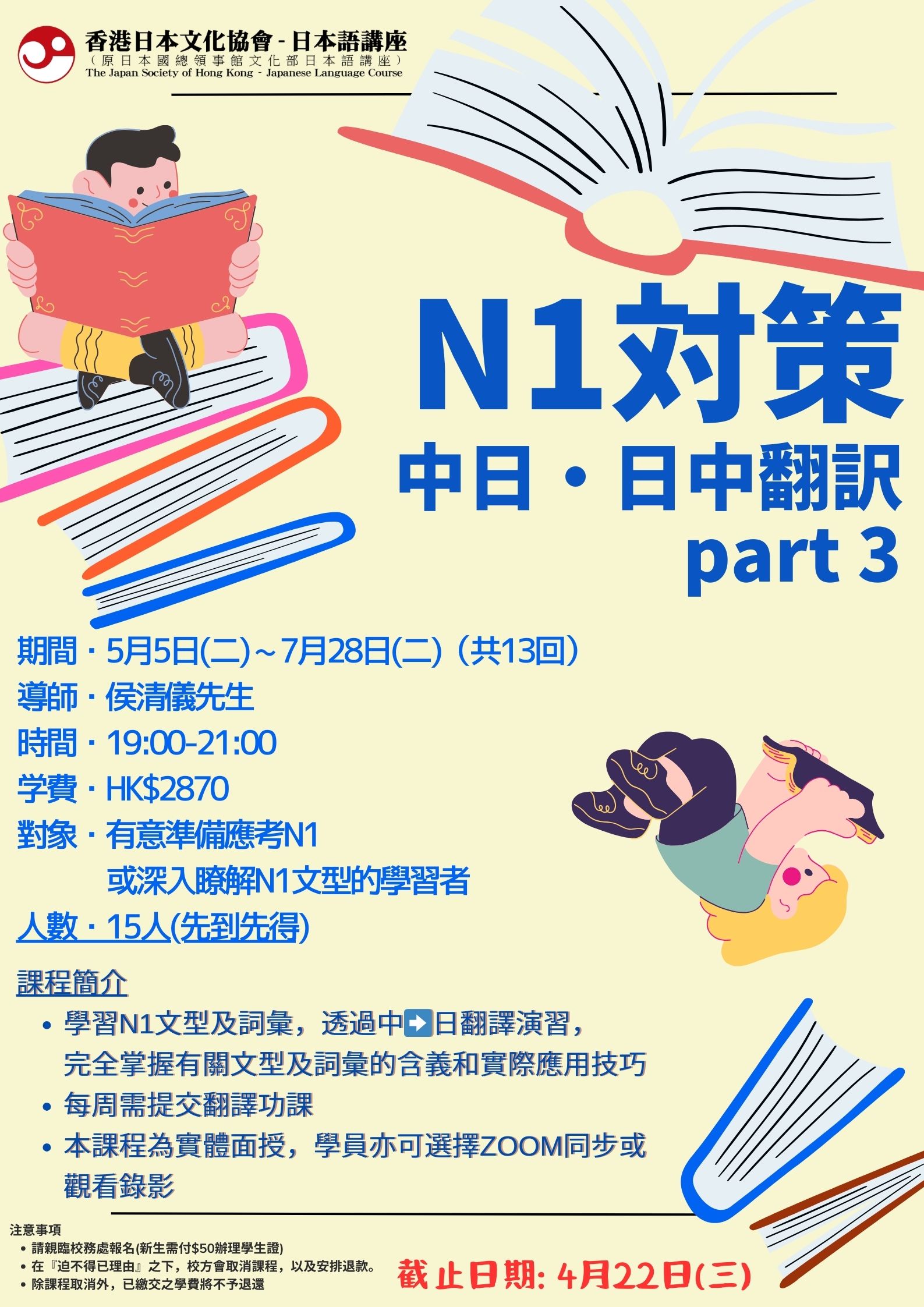學習N1文型,透過中日/日中翻譯演習,完全掌握有關文型的含義和實際應用技巧。 每周需提交翻譯功課。本課程為實體面授,學員亦可選擇ZOOM同步或觀看錄影。