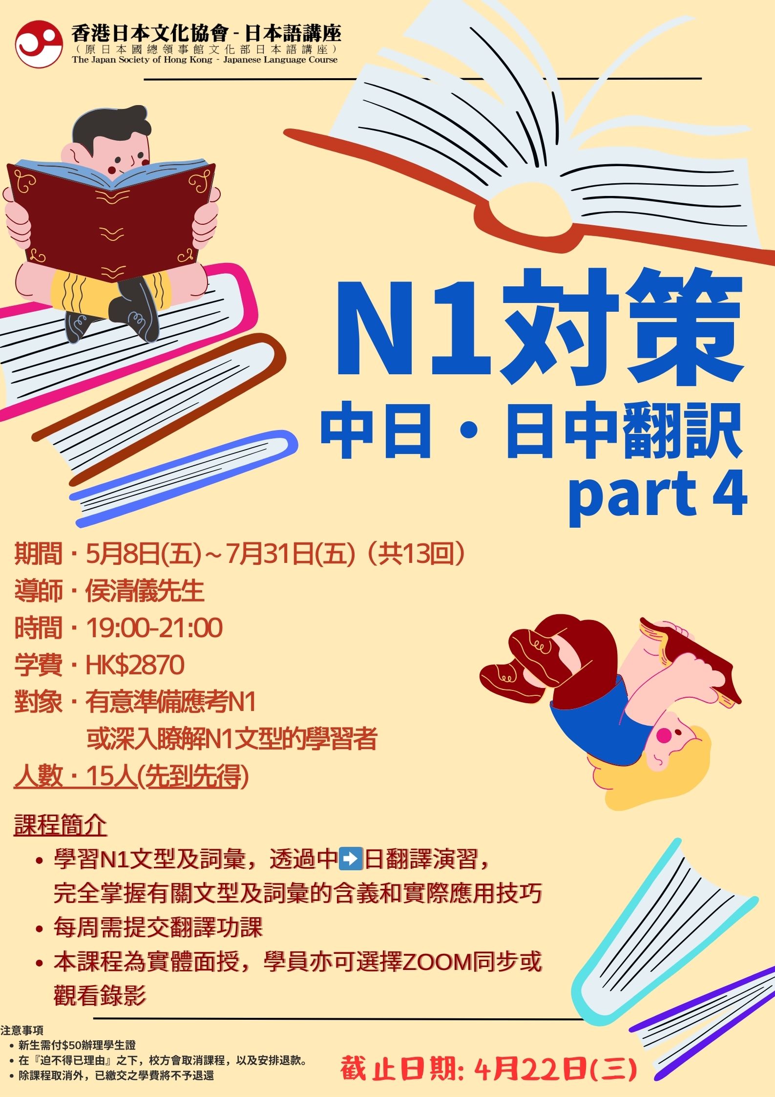 學習N1文型,透過中日/日中翻譯演習,完全掌握有關文型的含義和實際應用技巧。 每周需提交翻譯功課。本課程為實體面授,學員亦可選擇ZOOM同步或觀看錄影。 *現時尚有名額,如有興趣。請盡快報名。